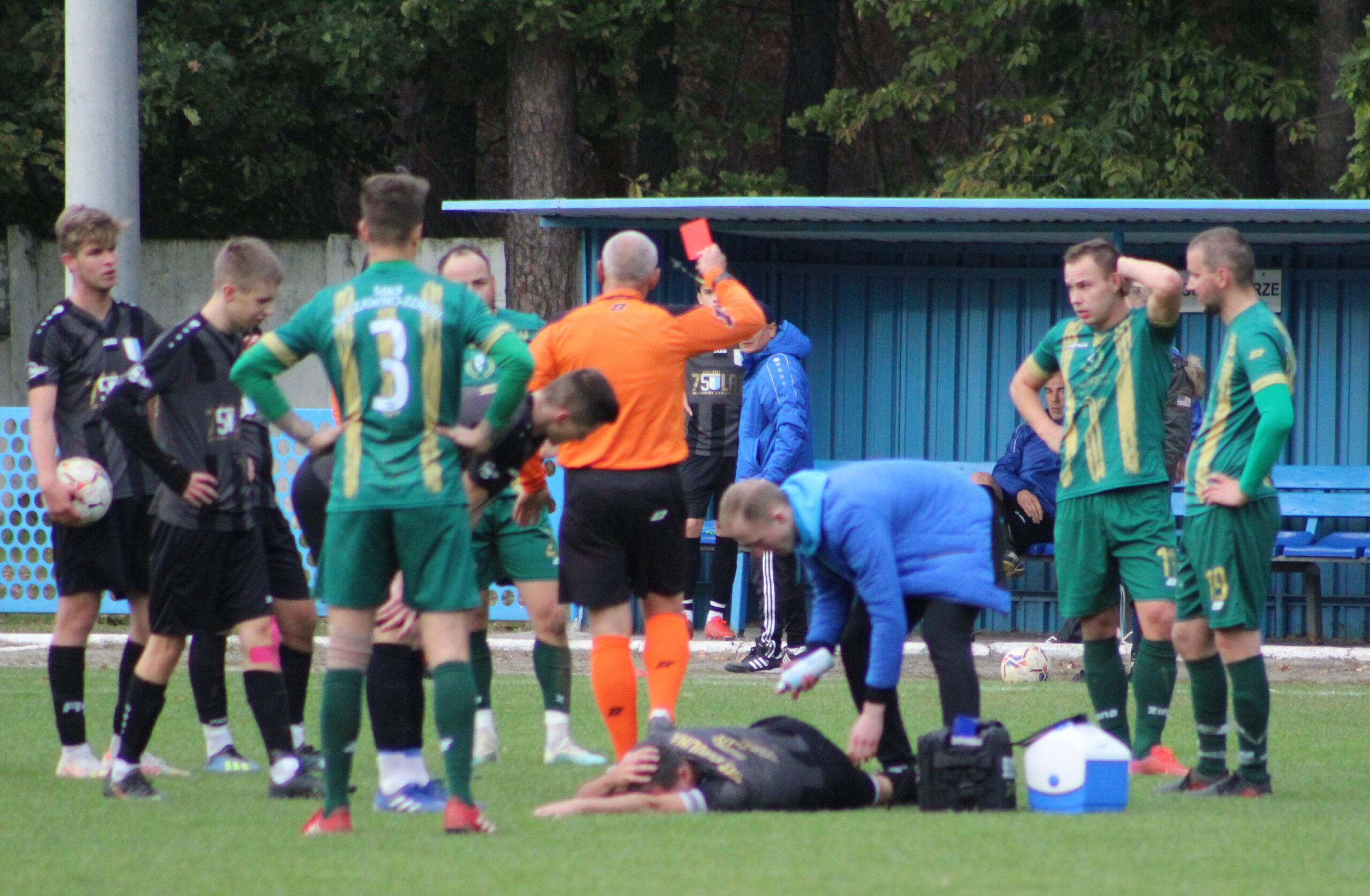 W następnej akcji, przed polem karnym gości, faulowany był zawodnik MKS Karolina. W wyniku bardzo ostrego faulu wywiązała się przepychanka na boisku , w której brała udział większość zawodników obu ekip. Po przywróceniu porządku sędzia obdarował czerwienią dwóch zawodników, po jednym z obu drużyn. Przy okazji napomniał żółtym kartonikiem trenera drużyny Szczawno- Zdrój, który w następnej akcji znów nerwowo reagował przy linii bocznej boiska, za co dostał drugą żółtą, w efekcie czerwoną kartkę i musiał opuścić ławkę rezerwowych.