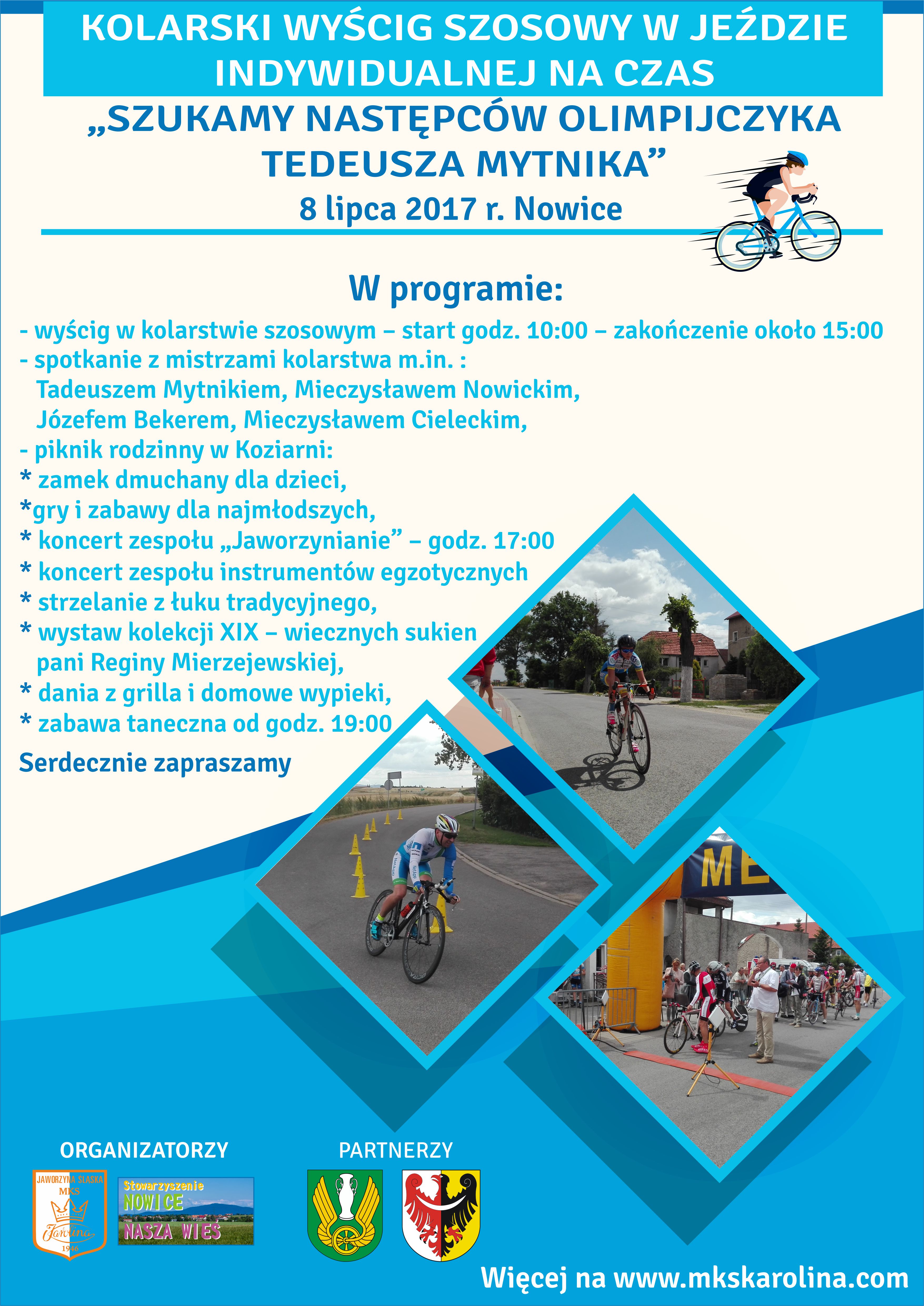 Już po raz czwarty Stowarzyszenie Nowice – Nasza Wieś i Miejski Klub Sportowy B&W „Karolina” organizują kolarski wyścig szosowy pn. „Szukamy Następców Olimpijczyka Tadeusza Mytnika”. W tym roku swoją obecność potwierdziły liczne gwiazdy kolarstwa, w tym sam Tadeusz Mytnik. Impreza odbędzie się w sobotę, 8 lipca 2017 r., tradycyjnie już w Nowicach, rodzinnej miejscowości Mistrza.