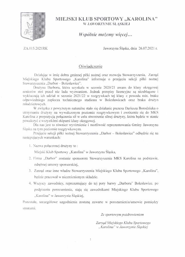 Poniżej oświadczenie Zarządu Miejskiego Klubu Sportowego Karolina Jaworzyna Śląska w sprawie przejęcie sekcji piłki nożnej „Darbor – Bolesławice”